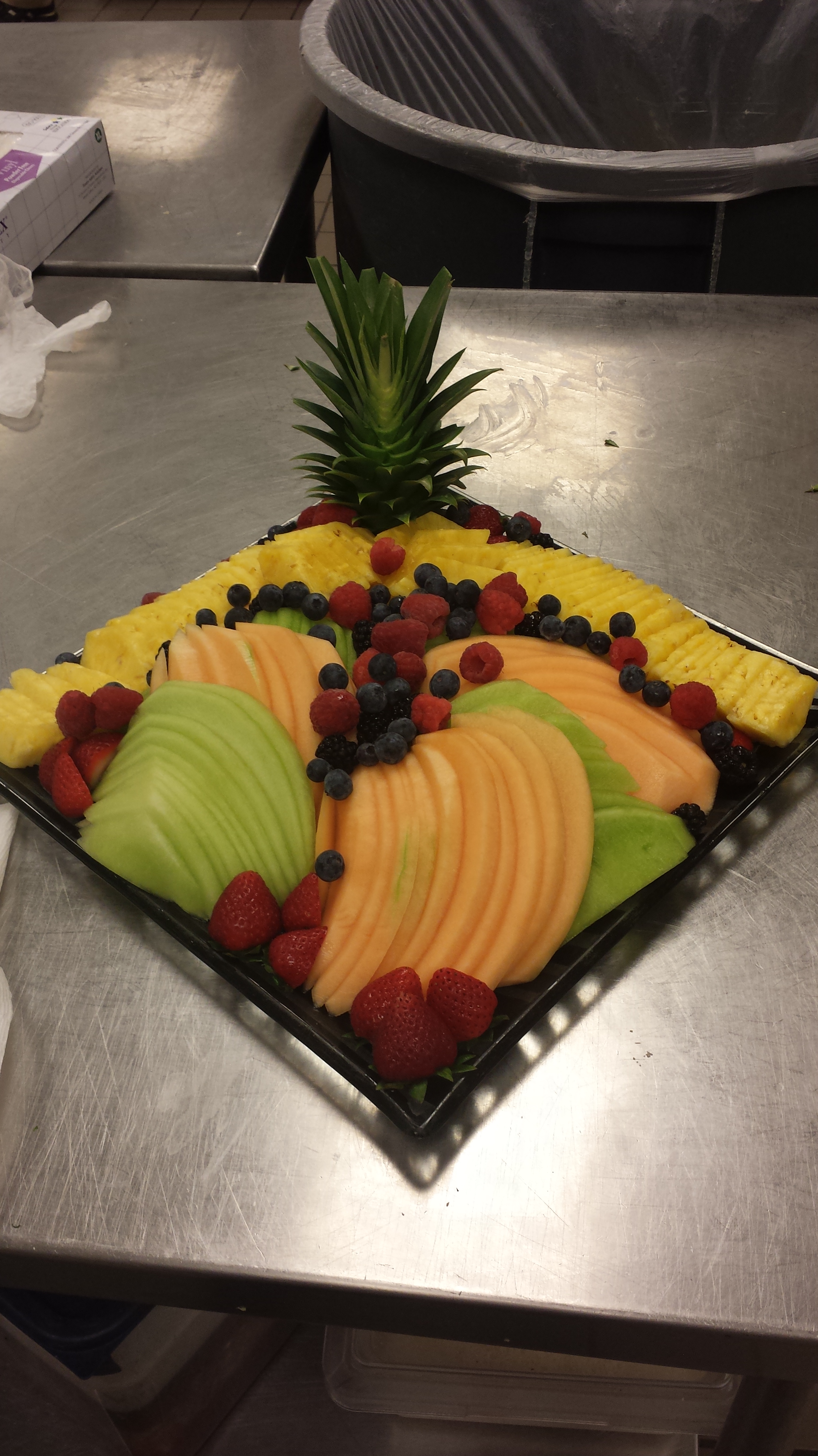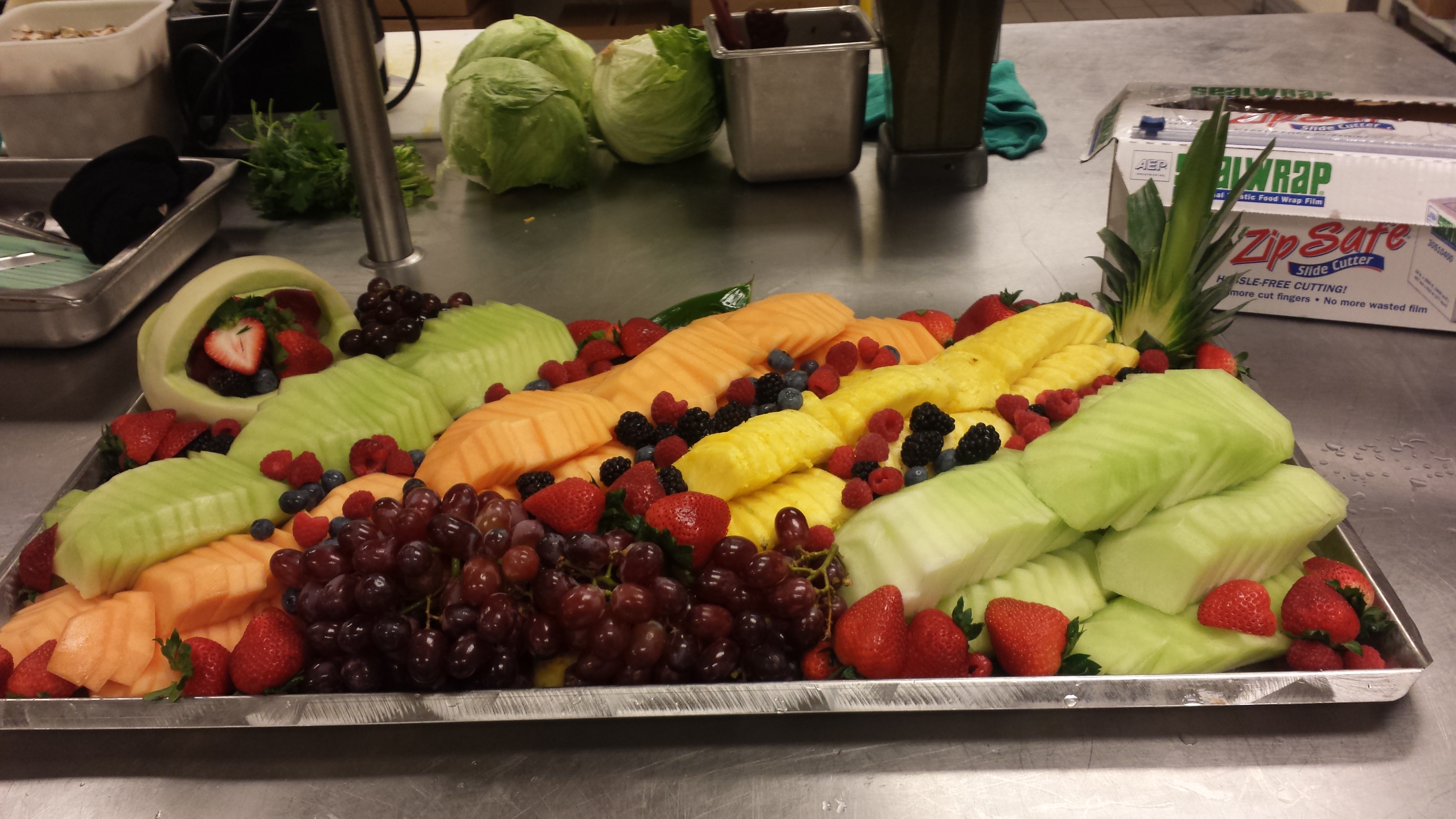 The most common fruit you will find on a platter is honey dew, cantaloupe, and pineapple. Oranges and grapefruits make for great garnishes, but short of doing slices, don’t usually hold up well to the display time of the platters. If in season I really like to get some papayas, kiwis, and star fruits, unfortunately since they are not a necessity and don’t always get eaten they are not used very often except for VIP events.