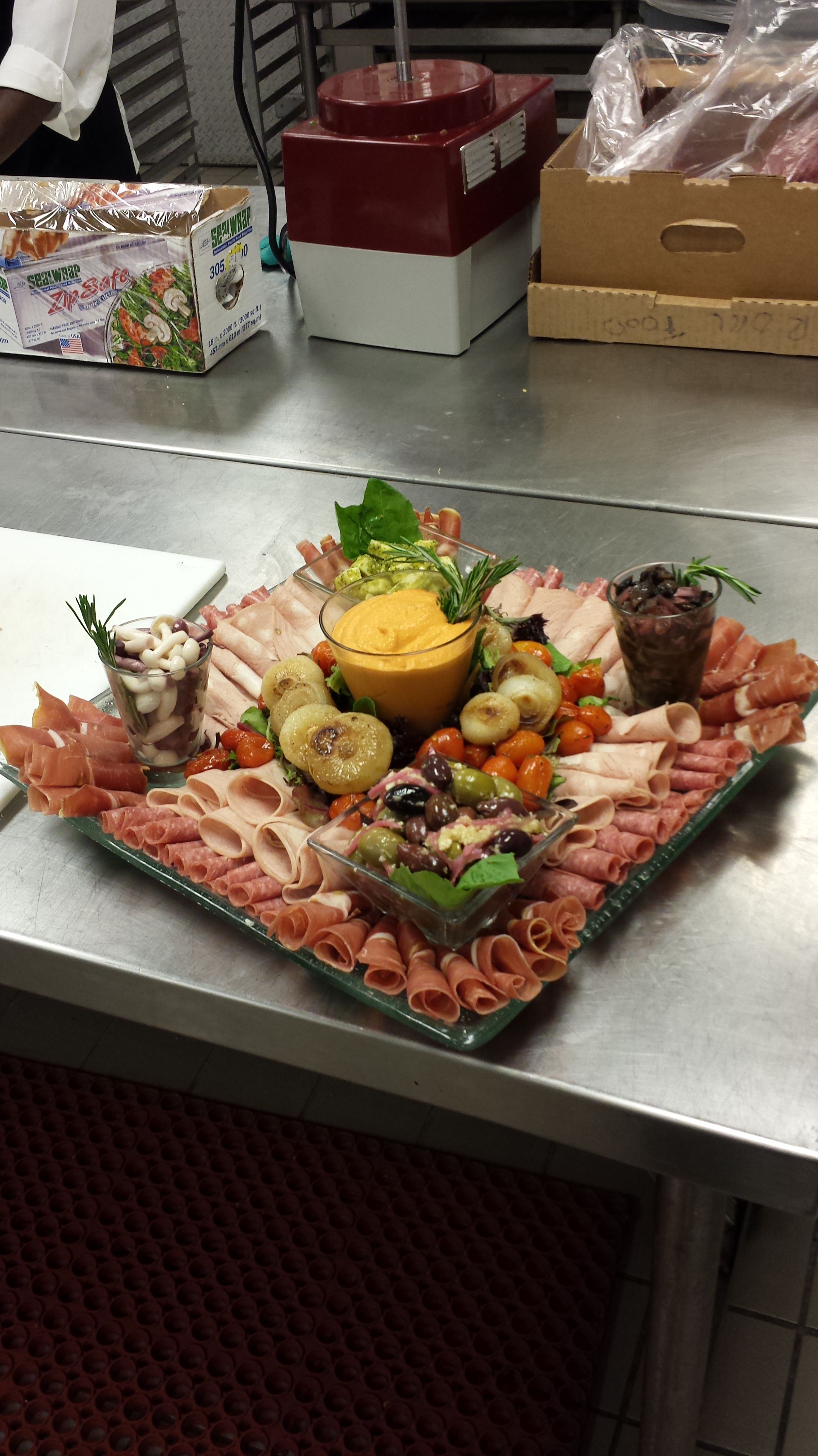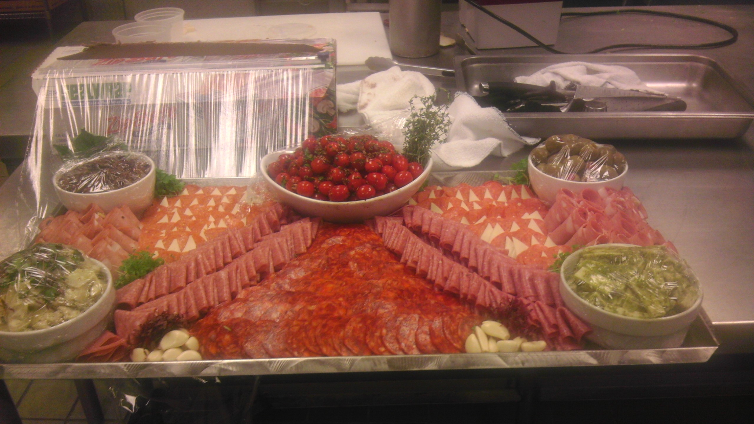 My favorite item on the platter is the eggplant capponata. it is chunks of eggplant made with tomato sauce, herbs and raisins, and makes for a excellent bread spread. There is so much you can do with these platters and items and get so many different presentations out of them. You can fold, roll, or slice the meats, dress the extras up however you like and put in all kind of dishes to give great depth to the platter, and you can cut the cheeses however you would like to give it that last little oomph. One of the things I like to do is tossed artichoke hearts in pesto, toss the olives in oils and pickled red onions, and marinade in oils and herbs grape tomatoes.