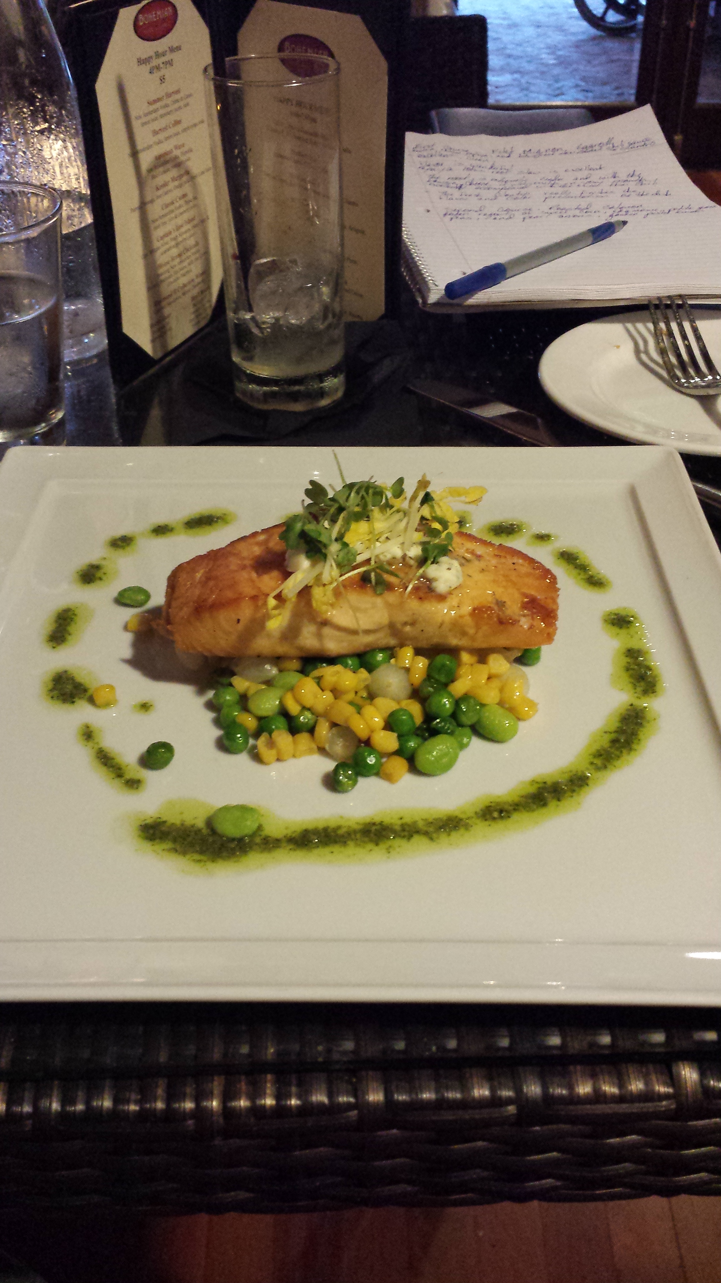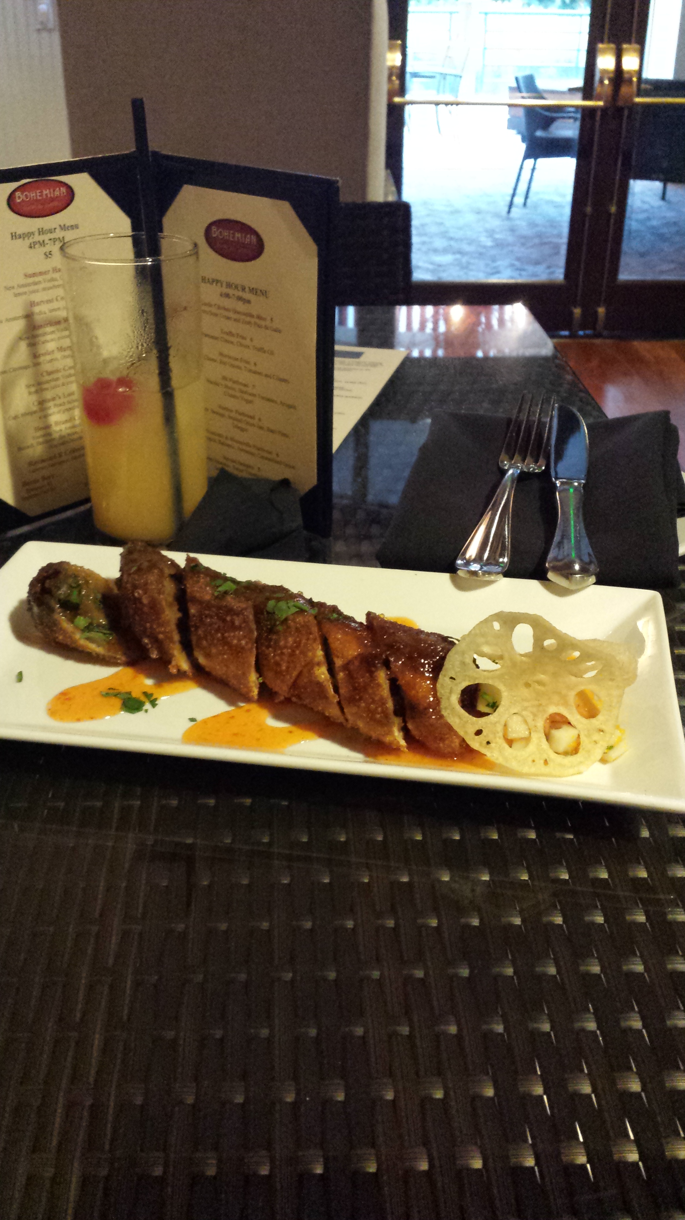 When I first chose to go with the Bohemian Bar and Grill and saw it on the website I thought it was the location downtown, come to find out there was a Bohemian Hotel in Celebration, Fl area. I knew of the area from when I worked at Disney, but had never actually been to the area and I was pleasantly surprised. When you drive into the area it is like nothing else in the Orlando area, the houses all were very small town architecture from the 50’s and the whole town of Celebration makes for this very nice, quaint little town on a lake, with this gorgeous hotel on the back end of it all. Honestly if it wasn’t for the menu peeking my curiosity I would still never know that this little gem is even back there. This is the place you go to impress that girl that said yes, that special night out with that special someone, or just need a night out where you feel like you aren’t in Orlando and instead someplace in another time.