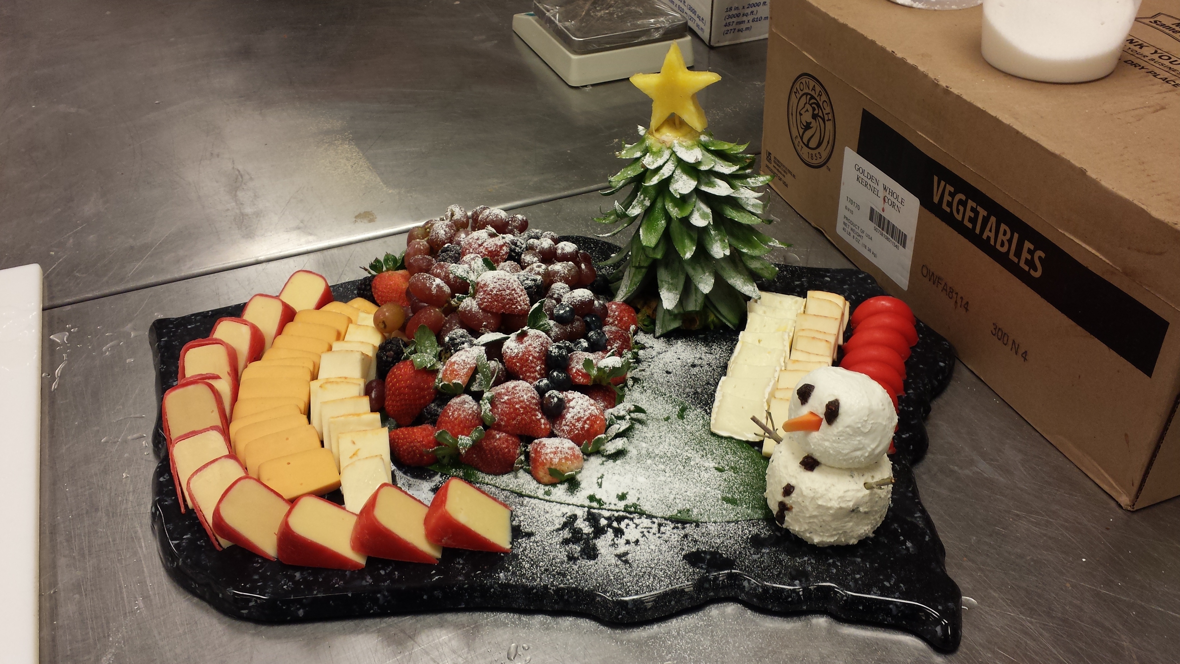 I decided to go ahead and put up a few cheese platters that I have recently done. The key to a good cheese platter is to make sure to have a array of various flavored cheeses, but to also get creative with the design and direction that you want the cheese platter to go. Always remember to have fun when building platters and to get creative as possible, as you can see when we had one platter for a Christmas party and I made the snowman out of goat cheese and a Christmas tree out of a pineapple top.