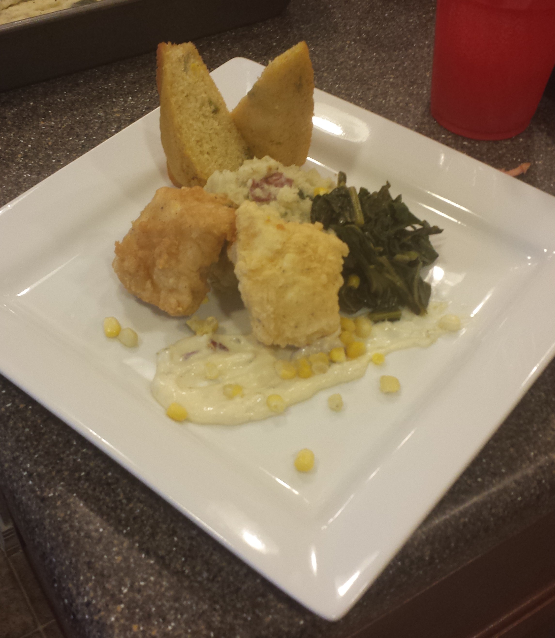 When I was figuring out the menu though I knew that I didn’t just want to fry some fish and throw it on a plate. I decided to stick southern and build a dinner around it. In doing so I came up wish a fish fry two ways. There was braised collard and kale, habenaro red bliss mash potatoes, jalapeno and honey cornbread, a roasted garlic and honey whipped butter, homemade tartar sauce, and the star of the dish Halibut. Now what I did to the halibut was where the real magic happened because I did some of it in a traditional corn meal dusting and then I did some in a amber beer batter. Then to top it off I did a peanut and canola oil mix.