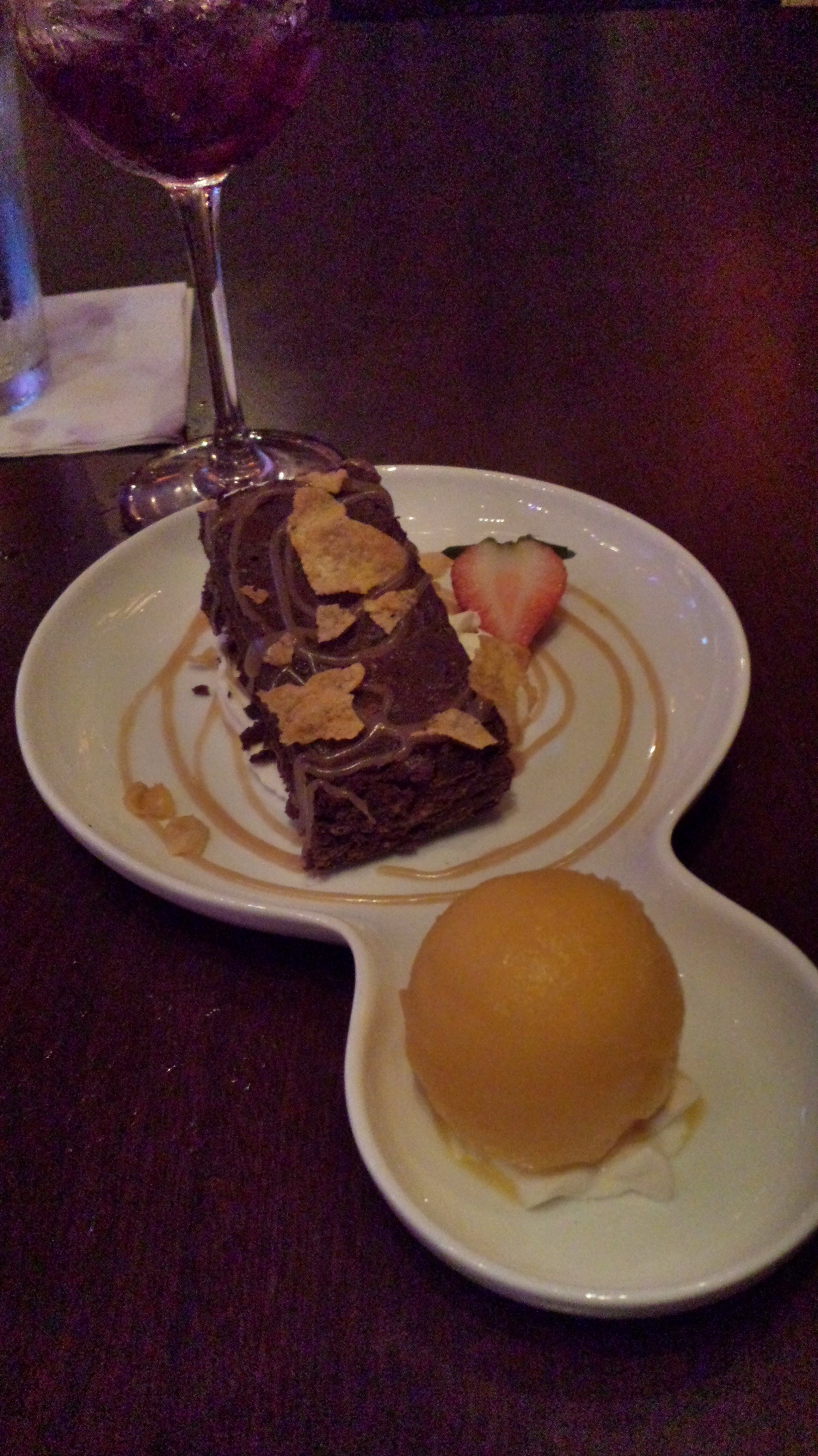 The bowl was clean with only a fork and a piece of the bone in the middle to signify the fact that there was food ever there, and now it was time for the dessert course. When this chocolaty crunch bar hit the table and I saw that beautiful Orange sorbet on the end of the plate I knew I had made the right choice. The colors, the design of the plate, that slight clash from the top of the strawberry, absolutely a work of art. I like the fact that the garnish on top of the crunch bar was corn flakes, but the supposed crunch bar actually wasn’t very crunchy, except for the flakes. It almost tasted like a cakey brownie with layers of wafers, which I will have to imagine they dipped or drizzled the liqueur on and that is why it wasn’t very crunchy. Honestly though I think I would have been okay if I received a big bowl of the orange sorbet with a mountain of the cream underneath it. I am not sure if the cream underneath the sorbet was different then the one under the crunch bar, but they sure tasted different. The cream under the sorbet mixed with the sorbet honestly tasted like the greatest frozen creamsicle I have ever enjoyed. I of course tried everything with everything, but I thing I should have ordered the Baked Hawaii and then a side of the sorbet.