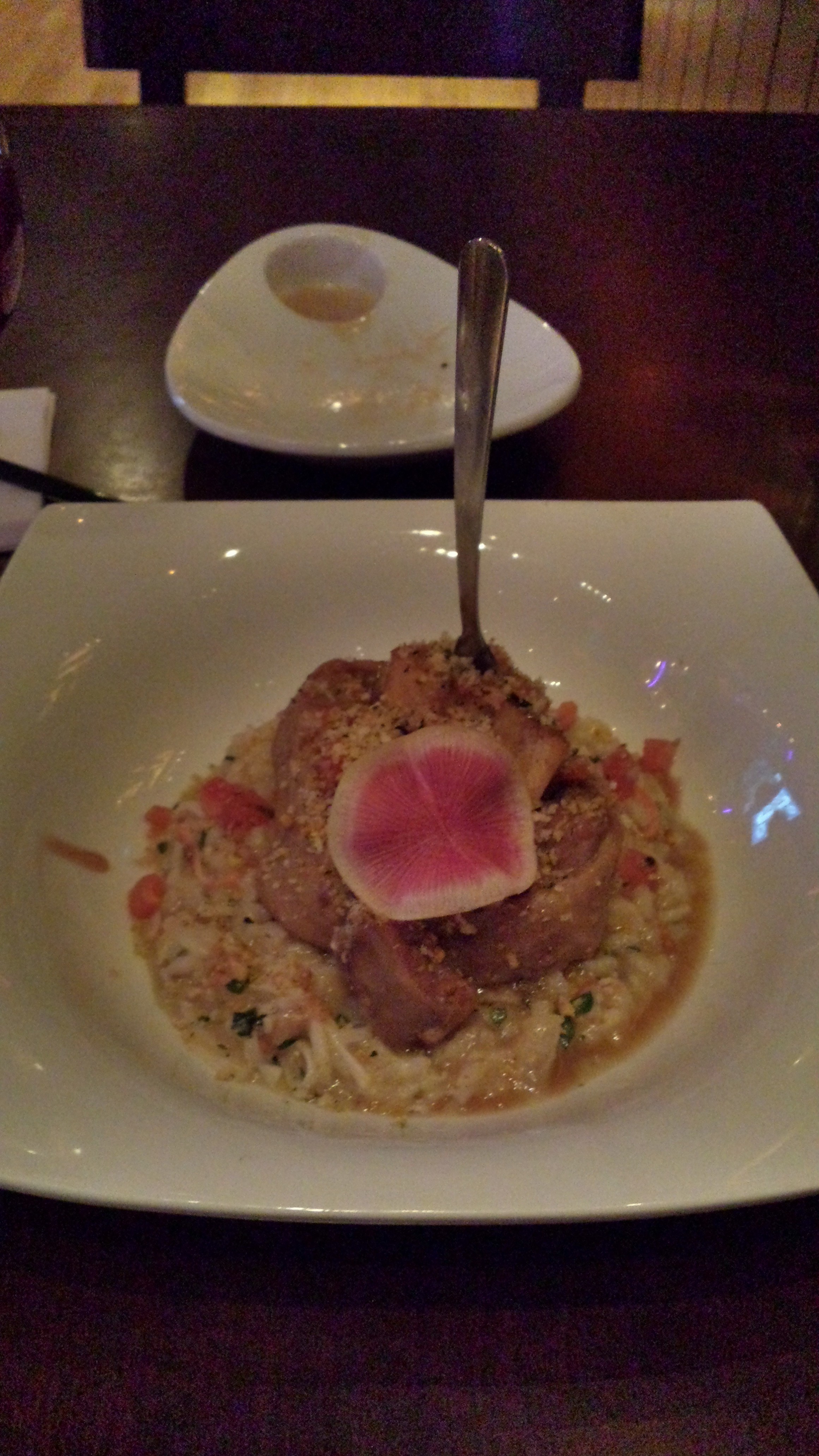The second came after, the Petite Osso Bucco with a Kani Kama Krab Risotto with Lomi Lomi Tomatoes and Taro “Poi” Sauce. This was absolutely phenomenal, the presentation in the bowl, the colors, the creaminess in the risotto, the strands of crab, this beautiful piece of Osso Buco in the center, and all topped with a cocktail fork right in the middle of the bone for me to enjoy the best part, which of course was the bone marrow. The Osso Buco was so tender that it fell apart as soon as I took the picture, with only that little bit of fat around the center holding it all together. The bone marrow was flavored so wonderfully that it almost tasted like a really soft and creamy cheese with a hint of beef flavoring. But the risotto and the sauce was really where it all hit home. I really like a creamy risotto that is right at that just past al dente, and the flavor of the sauce in combination with it all was exactly what I would expect to get from such a place. Honestly I was full at this point, but that fat kid inside of me could have put down another plate with ease and then thrown in the towel. My only problem with this dish was once again a lack of detail and a little of the sauce was on the inside rim of the bowl. When you are just out and enjoying, these little details don’t really make or break a place. But this is no ordinary place, this has Emeril’s name and face everywhere, the price point is high for the average Jo and culinarian, and when you have been waiting to go to a place and you see these miss details you kind of have to shake your head and sigh.