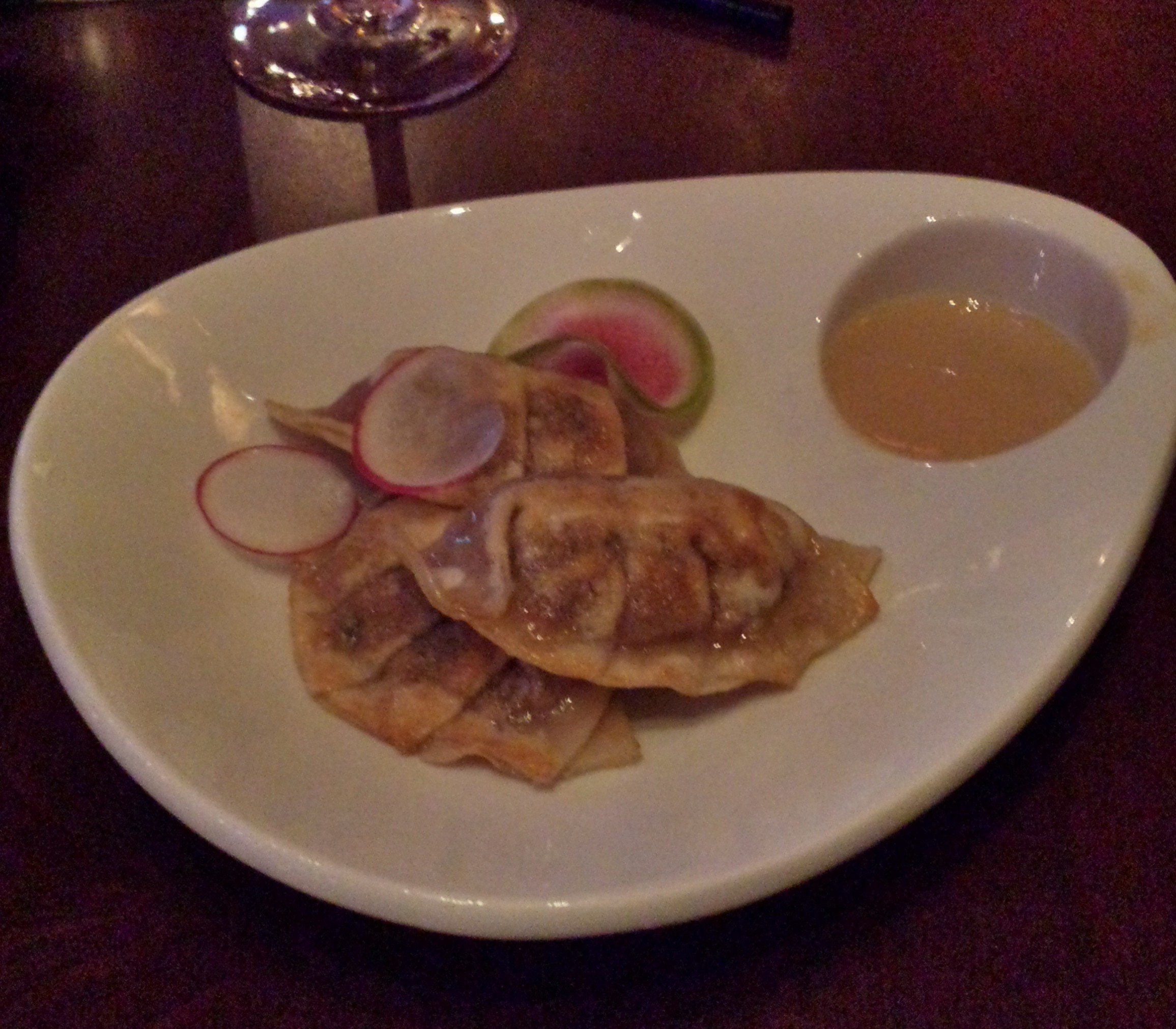 The first course then came out, I really liked the presentation, the china choice, how the sauce already had a complementing spot, and the watermelon and regular radish garnishes. My only complaint with what I received was that the sauce came up and out of the designated area and onto the side of the plate. But the flavor of the Potstickers was really good, all three were well seared and had a nice crunchy texture on the outside and then a nice mushy center, which is what you would expect from a ratatouille filling. The accompanying sauce was a creamy roasted garlic tofu dressing, I can’t say I got all those flavors, but I can say that the sauce was really colorful, with a smooth almost creamy texture that did not overpower the potstickers and accompanied them very well.