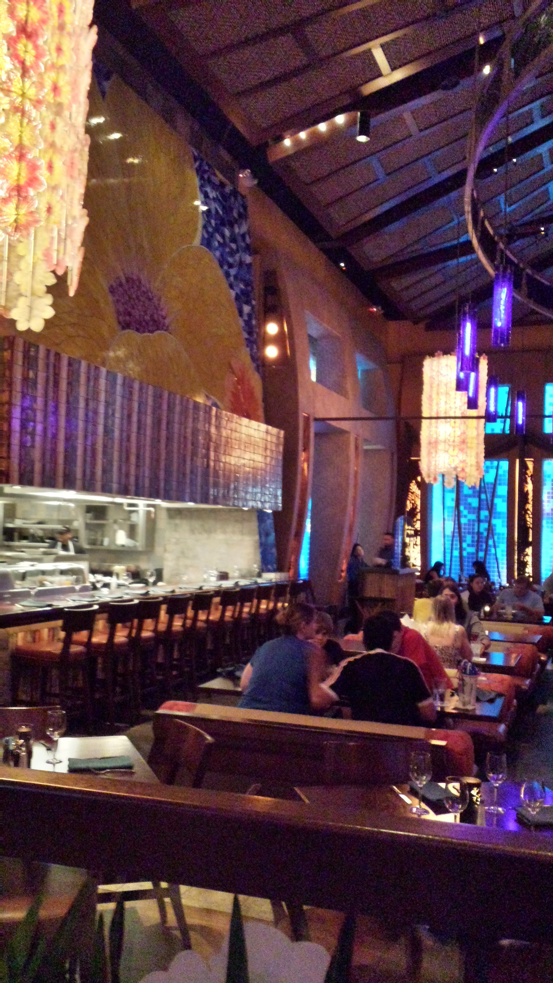 When I first arrived I parked in the lot in the self parking area and walked through the main atrium of the Pacifica Ballroom of the Royal Pacific Hotel. I was a short distance from the restaurant and I decided to opt out of the complimentary valet parking, I never turn away a little extra cardio. When you turn right out of the main atrium you see the sign for the restaurant and it really gives you that flashy feel that is definitely a Emeril trademark. I entered the restaurant and really loved the atmosphere and decor of the location, all the tables and chairs were dark wood, bamboo stalks, blue and baby blue tiles, with a gold scheme around the main areas, and really pretty flower chandeliers. I do feel the music could have been a little different since I just didn’t really feel like any of the songs really went with what you would expect from the theme. Had a pop, techno kind of feel instead of a laid back island feel. I loved the open kitchen in the middle of the back wall of the restaurant being the first thing you see, and just the whole layout of the place made you feel like they really took there time when they laid out the plans with the space they had.